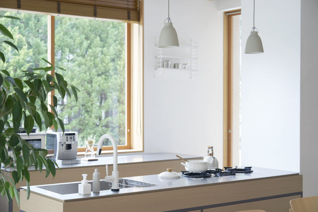 壁に向かって作業する従来のキッチンとは異なり、対面キッチンは視線が奥まで抜けて空間の広がりを感じられます