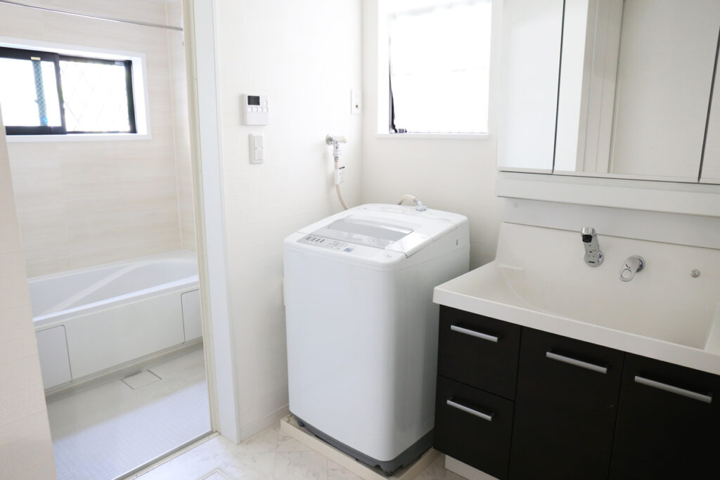 洗面室の間口を正確に測り、洗面台だけでなく、洗濯機や収納棚を置くスペースも考慮して、最適な幅を選びましょう。